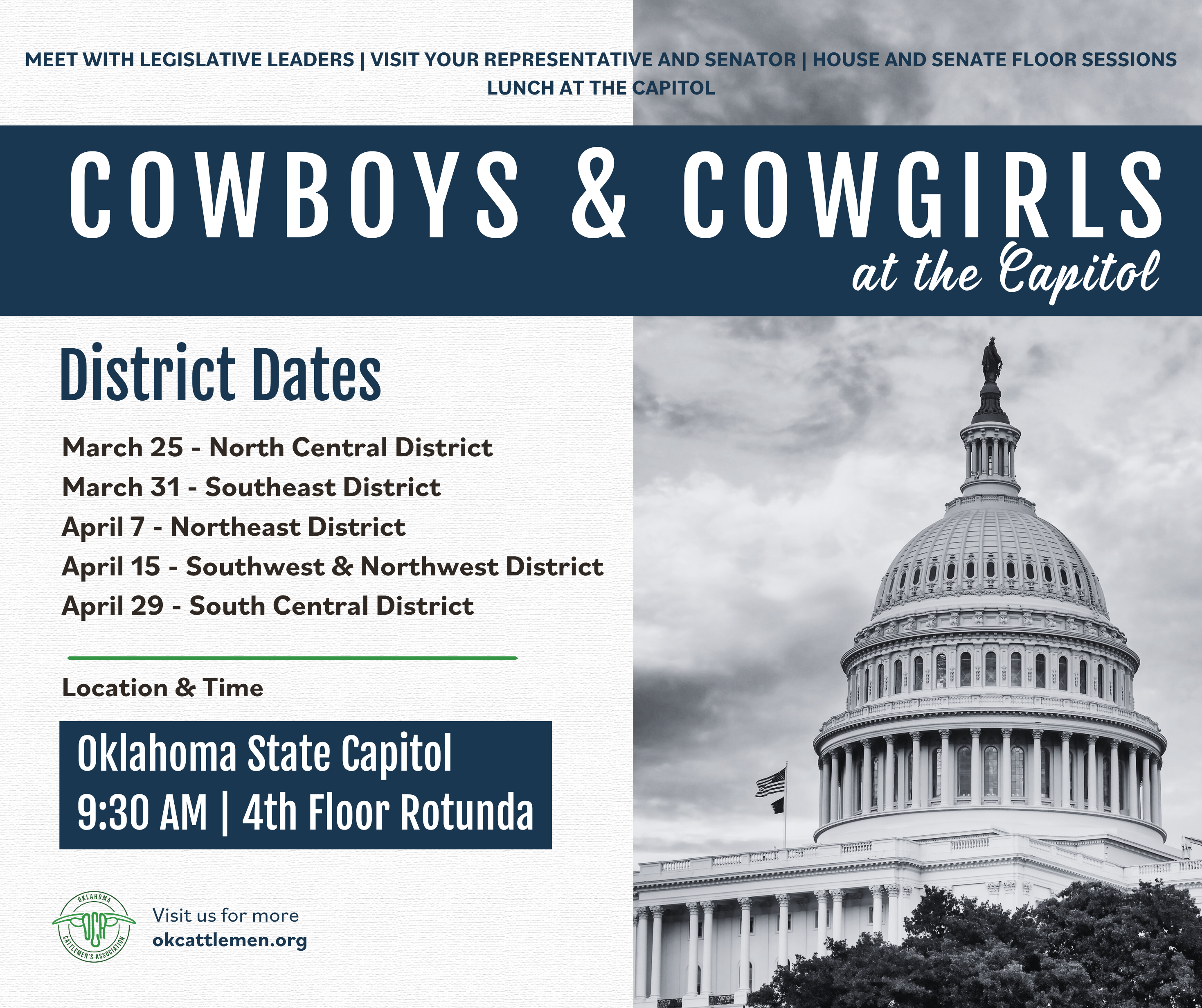 Participants spend the day at the State Capitol building relationships, discussing key industry priorities, and ensuring the voice of Oklahoma’s cattle industry is heard clearly and effectively. Whether you are a seasoned advocate or attending for the first time, Cowboys and Cowgirls at the Capitol is an important opportunity to be involved in the legislative process and stand alongside fellow producers in support of our industry.