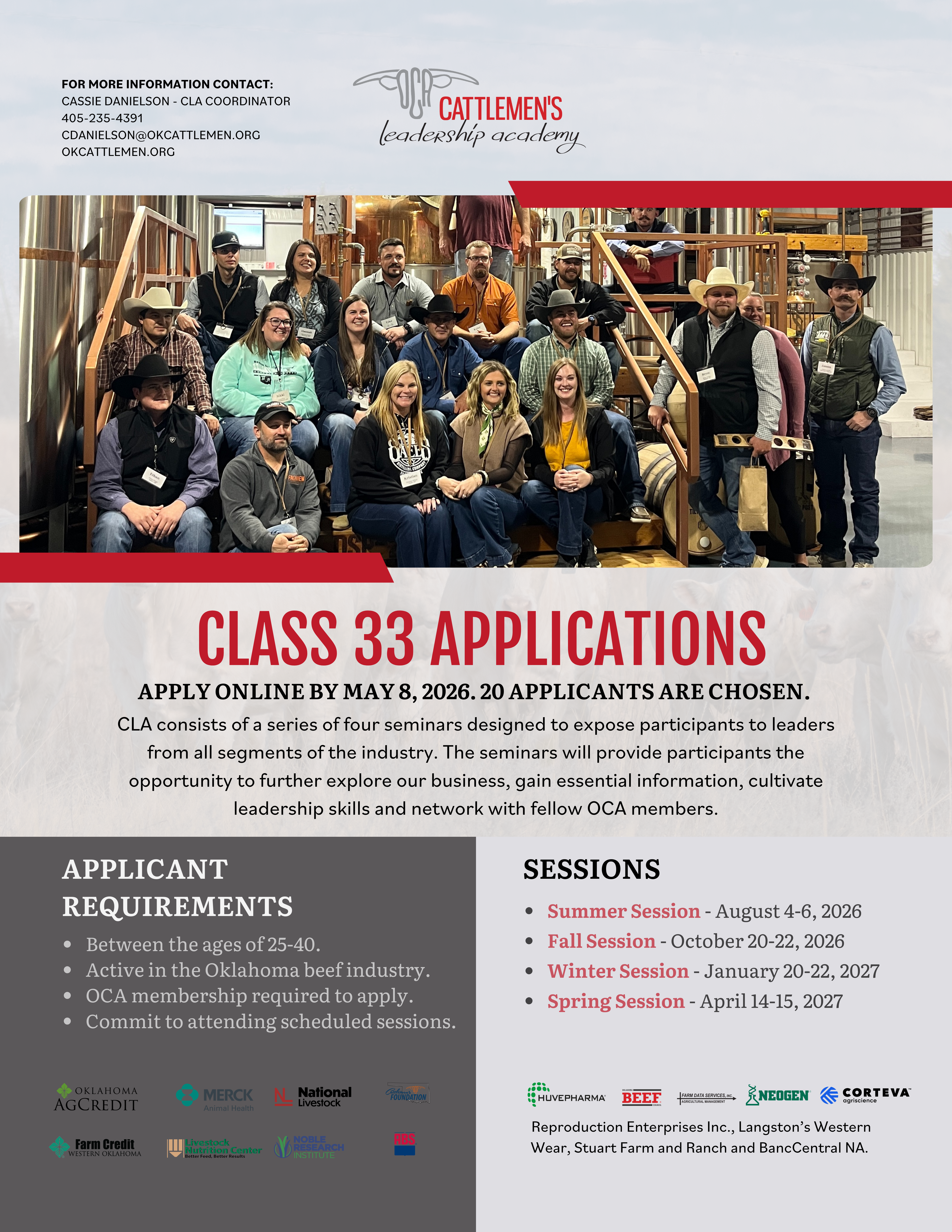 This is an excellent opportunity to become a more informed and prepared future leader of the cattle industry. The CLA year runs from July to July. If you would like to learn more about the program, call the OCA Office at 405.235.4391.