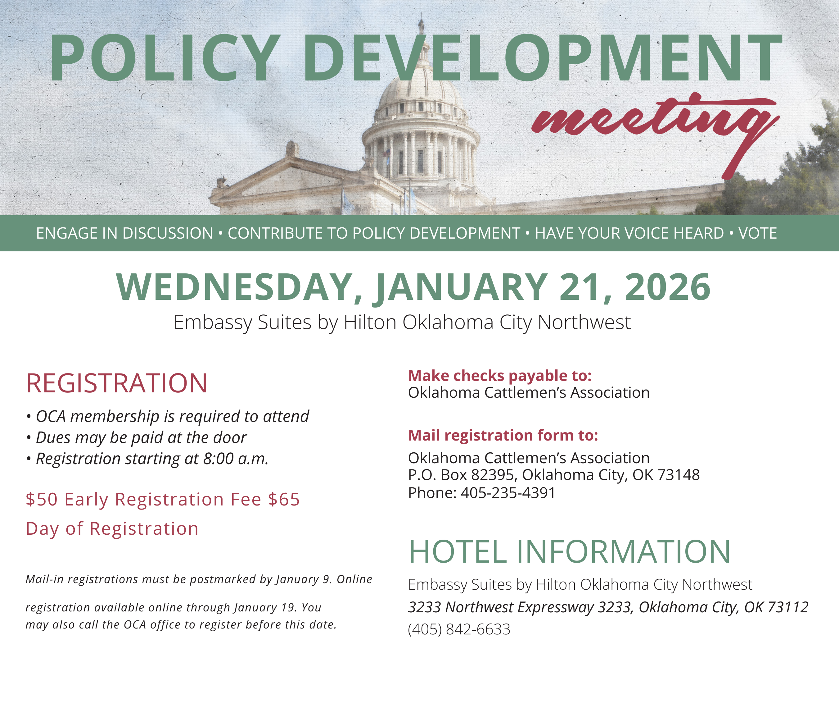 Share your thoughts, exercise your membership voting power and help chart the course for a successful Oklahoma beef industry! Member Engagement is Vital to the Success of Policy Development! Be sure to attend the 2026 Annual Winter Policy Meeting.